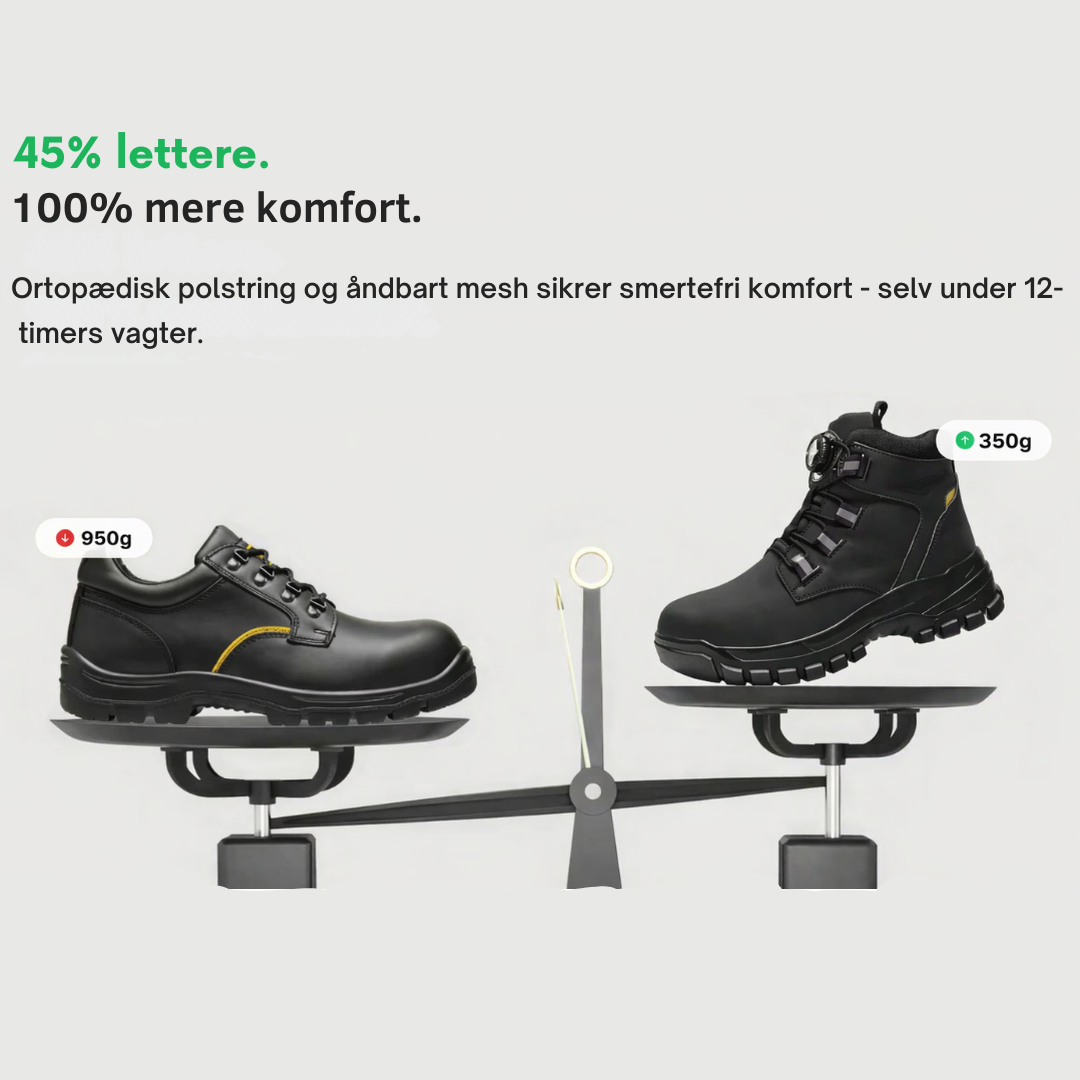 Skoene er designet til at være markant lettere end traditionelle sikkerhedsstøvler. De anvender moderne, letvægtsmaterialer, som reducerer vægten uden at gå på kompromis med sikkerhed, stabilitet eller holdbarhed. Det gør dem mere komfortable at bruge i løbet af lange arbejdsdage og mindsker træthed i fødder og ben.